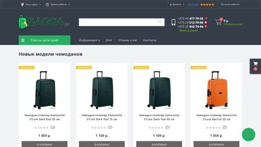 | AI-анализ | --- The website Bag24.by is an online shop in Minsk, Belarus, specializing in the sale of luggage. The store offers customers the opportunity to purchase a selection of three luggage pieces. A gift is provided with each purchase, and delivery is available in Minsk and Belarus. The website sells high-quality merchandise. The shop categories include luggage of various sizes for hand carry, large and extra-large suitcases, suitcases on wheels, plastic and fabric suitcases, suitcases for women and men, aluminum suitcases, and backpacks. There are also categories for city and universal rucksacks, tourist and school suitcases, pouches, portfolios, and accessories such as umbrellas, wallets, belts, and luggage covers. The website offers new models of luggage and popular items like the Samsonite S'Cure in |