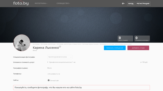 | AI-анализ | --- This online resource is the personal website of photographer Karina Lysenko based in Minsk, Belarus. The site primarily showcases her work in the category of architectural photography. Visitors to the site can explore a variety of architectural images captured by Lysenko. The website also features information about her services, pricing, and contact details. The domain name for this resource is lysenko.foto.by. |
