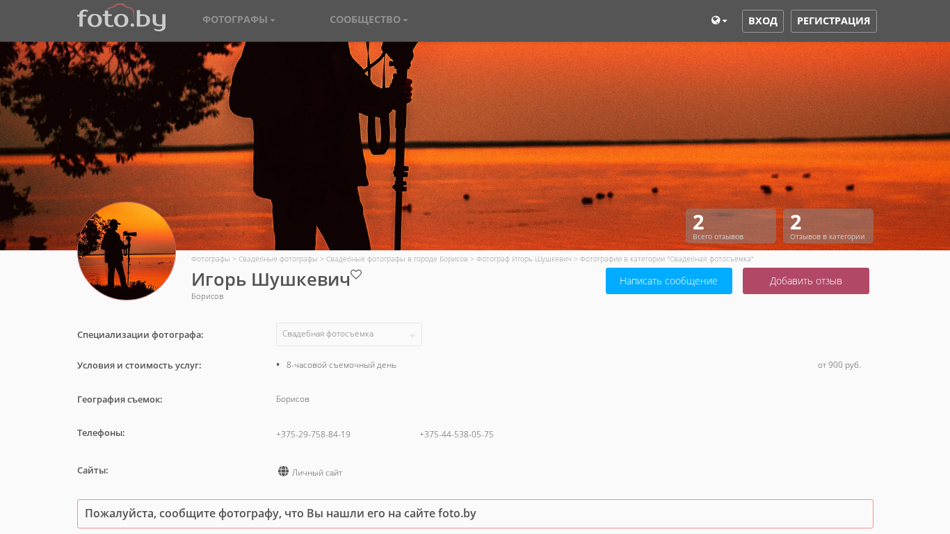 | AI-анализ | --- The web project "Shushkevich.foto.by" is a photography website by Igor Shushkevich based in Borisov, Belarus. The site primarily features photos in the "Svaedbnaia fotosyemka" (wedding photography) category. Igor specializes in various types of photography including love stories, children's photography, and wedding photography. The site provides information on the conditions and pricing for his services, which include an 8-hour shooting day starting from 900 rubles. The geographical area for shoots is limited to Borisov. The website also includes a personal site and contact information, with phone numbers +375-29-758-84-19 and +375-44-538-05-75. |