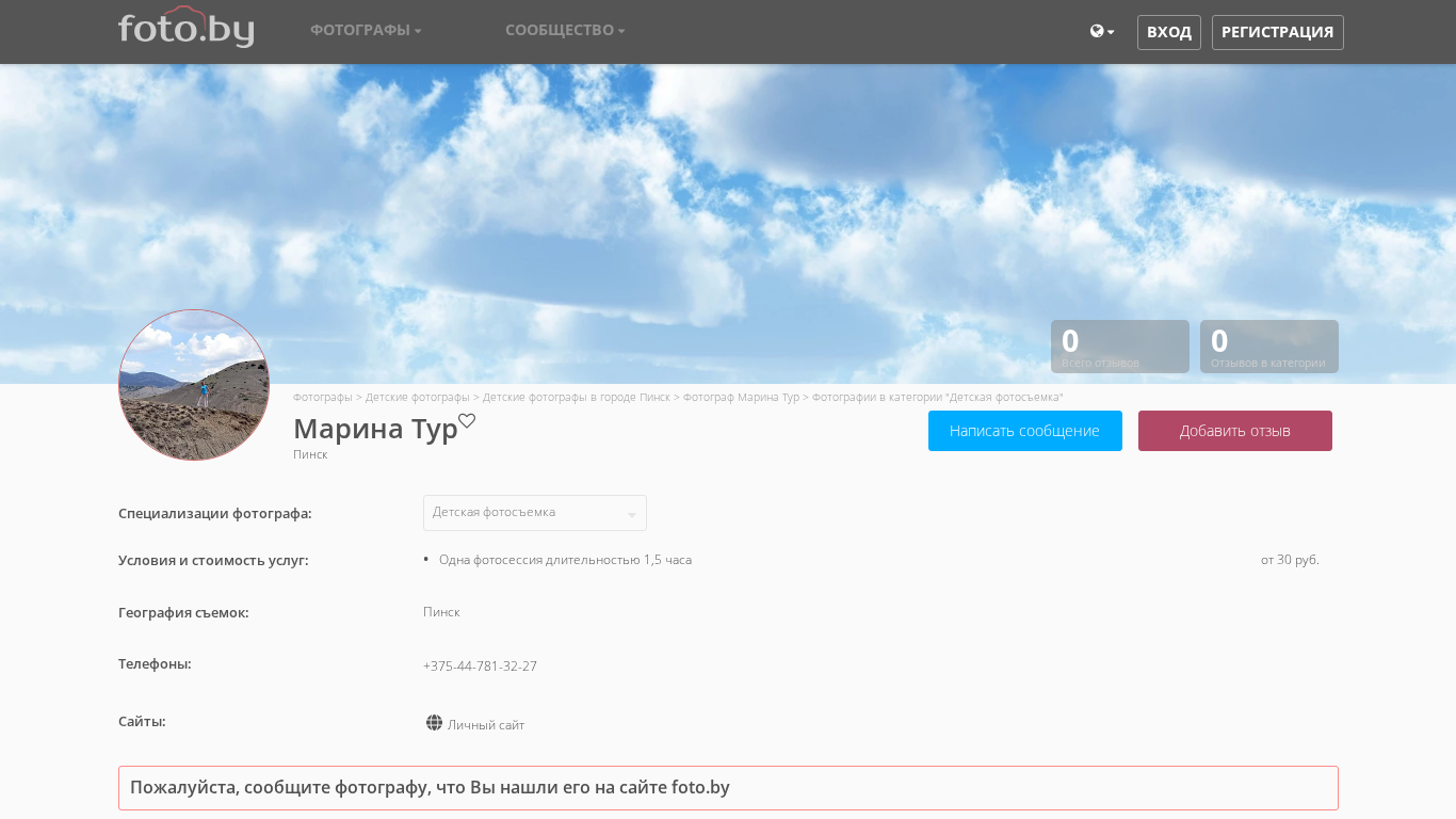 | SEO-описание | Фотографии в категории "Детская фотосъемка". Фотограф Марина ТУР - выполняю следующие виды фотосъемок: детская фотосъемка. Работаю в городах: Пинск |