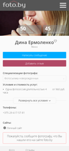 | AI-анализ | The website is a personal portfolio of photographer Dina Ermlenko from Minsk, Belarus, showcasing her work in the category of newborn photography. The site contains information about her services as a family photographer for newborns in Minsk. The top keywords of the site include 'newborns', 'photosession', 'photographer', 'Minsk', and 'photographs'. The site has 45 reviews in total, with 50 reviews in the 'newborns' category. The photographer's specializations include newborn photography, family photo sessions, and photography for pregnant women. The pricing for one photo session is from 960 rubles and the geographic coverage is limited to Minsk. The site includes contact information, a personal website, and a link to write a review. |
