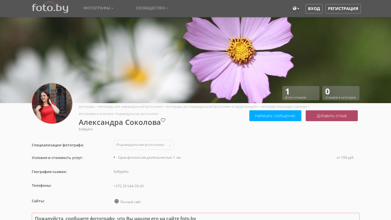 | SEO-описание | Фотографии в категории "Индивидуальная фотосъемка". Сайт фотографа Александра Соколова. Я работаю как фотограф для индивидуальной фотосъемки в Бобруйске. |