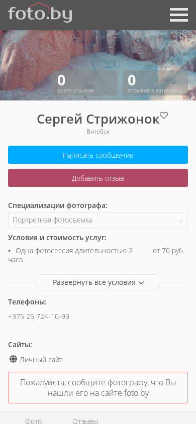 | AI-анализ | --- This website is a personal photography portfolio of Sergey Strizhonk from the city of Vitsebsk, Belarus. The website primarily features portraits under the category "Портретная фотосъемка." The photographer specializes in various types of photography, including portraits, boudoir, and nudes. He provides his services in the cities of Vitsebsk and Minsk. The site includes a catalog of photographers, a community for photographers, and a blog. Visitors can write messages, leave reviews, and find information about the photographer's specifications, prices, and contact details. The website also offers a personal site for the photographer. |