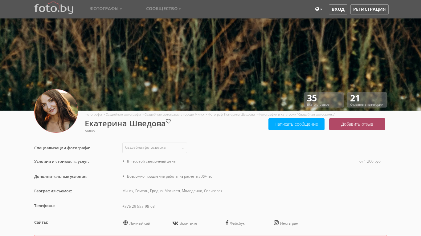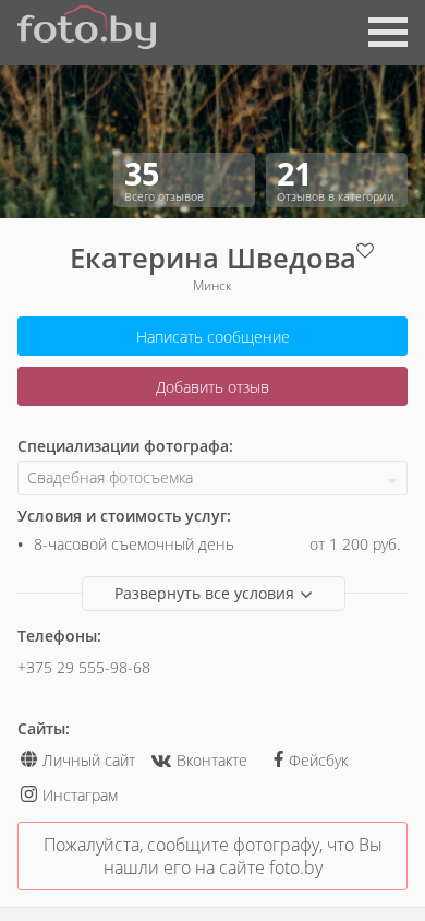 | AI-анализ | --- This online resource is a photography website by Ekaterina Shvedova based in Minsk, Belarus. The main focus of the site is showcasing photographs in the "Свадебная фотосъемка" (Wedding Photography) category. The photographer offers services as a wedding, family, event, and Love Story photographer. The site contains a catalog of photographers, with Ekaterina Shvedova being one of them. Other categories in the catalog include automobile, animal, architecture, childcare, aerial photography, pregnant women, individual photo sessions, marketplaces, New Year's, interiors, club, content, concert events, birth, newborns, education in photography, panoramic 360°, portrait, product, product in 3D, industrial, reclaming, swadbev, family, food (fud), and |