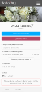| AI-анализ | This online resource showcases the photography portfolio of Olga Ralovec, a wedding photographer based in Vitsebsk, Belarus. The website contains a category of photographs dedicated to wedding photo sessions. The site is part of the larger community of photographers on foto.by, with options to view other photographers' works, join the community, and leave reviews. The main page of the site displays the catalog of photographers by default, but can be changed to show the community instead. The photography services offered by Olga include wedding, New Year, and family photo sessions, with pricing starting at 800 rubles for an 8-hour shoot in Vitsebsk. The site also includes contact information, with a phone number and personal website link provided. |