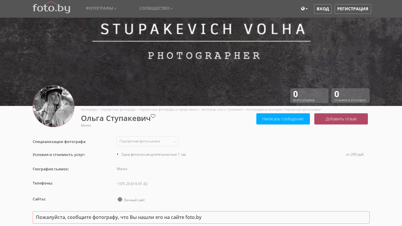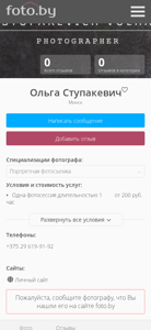 | AI-анализ | The website is a photography portfolio of Olga Stupakevich, a photographer based in Minsk, Belarus. The site features photographs categorized as 'Портретная фотосъемка' (Portrait Photography). The photographer also works in Dzerzhinsk and other regions of the Minsk Oblast. The top keywords include 'фотосъемка' (photoshoot), 'фотограф' (photographer), 'минск' (Minsk), and 'фотографии' (photographs). The site offers individual photo sessions and photography at concerts. The pricing for a one-hour photo session starts at 200 rubles. The photographer's contact information includes a phone number and a personal website. |
