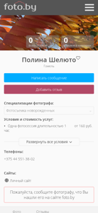| AI-анализ | date: 2021-11-24 This online resource is a personal website showcasing the portfolio and services of photographer Polina Shelyuto, specializing in newborn photography. Based in the city of Homel, Belarus, the site offers domestic photo sessions for families. The website features a catalog of categories, including newborn photography, with a total of 11 occurrences in the given data. The site includes a blog, contact information, and a section for testimonials. The photographer's services include one hour-long photo session starting from 160 rubles, and they cover the geographic area of Homel. The site can be accessed at paulinesheluto.foto.by and was visited on November 24, 2021. |