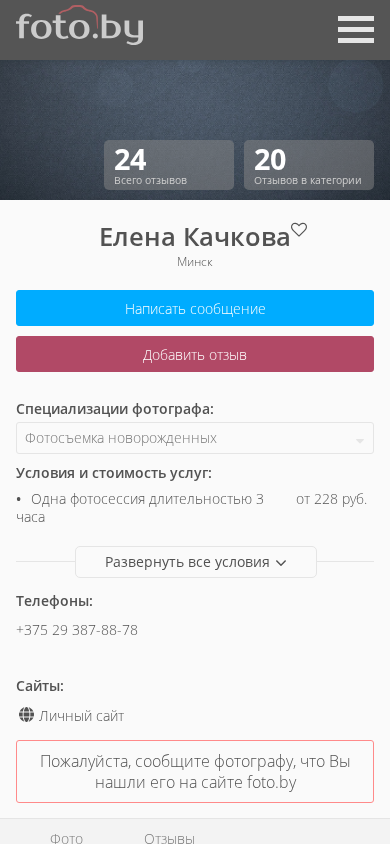 | AI-анализ | The website of photographer Elena Kachkova from Minsk, Belarus. She specializes in photographing newborns. The site includes a catalog of photographers, with Elena Kachkova listed under "Photographers > Photographers of Newborns > Photographers of Newborns in the city of Minsk". The site provides information on her services, pricing, and contact details. The website is in Russian and Belarusian languages. The site was visited on December 9, 2022 and had 20 reviews in the "Newborn Photography" category. Elena Kachkova offers her services as a photographer of newborns in Minsk. Her pricing starts from 228 rubles for a three-hour photo session. The site includes a personal blog and a gallery of her work. The site also has a community section for |