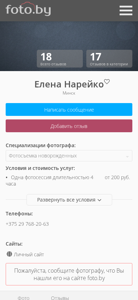 | AI-анализ | --- The website "Alena Nareiko.foto.by" is a personal portfolio of photographer Alena Nareiko, based in Minsk, Belarus. The website primarily focuses on showcasing her photography work in the category of "newborn photo shoots." Visitors can find information about various types of photo shoots offered by Alena, including child photography, maternity photography, and newborn photography. The photographer covers areas in and around Minsk. The website also contains a community section where users can leave reviews and view other photographers' work. The main page alternates between the catalog of photographers and the community of photographers. The site includes a blog, announcements, and statistics, as well as options for users to write messages and add reviews. Contact information for the photographer, including a personal website and phone number, is also provided. The website is accessible in both Russian and Belar |
