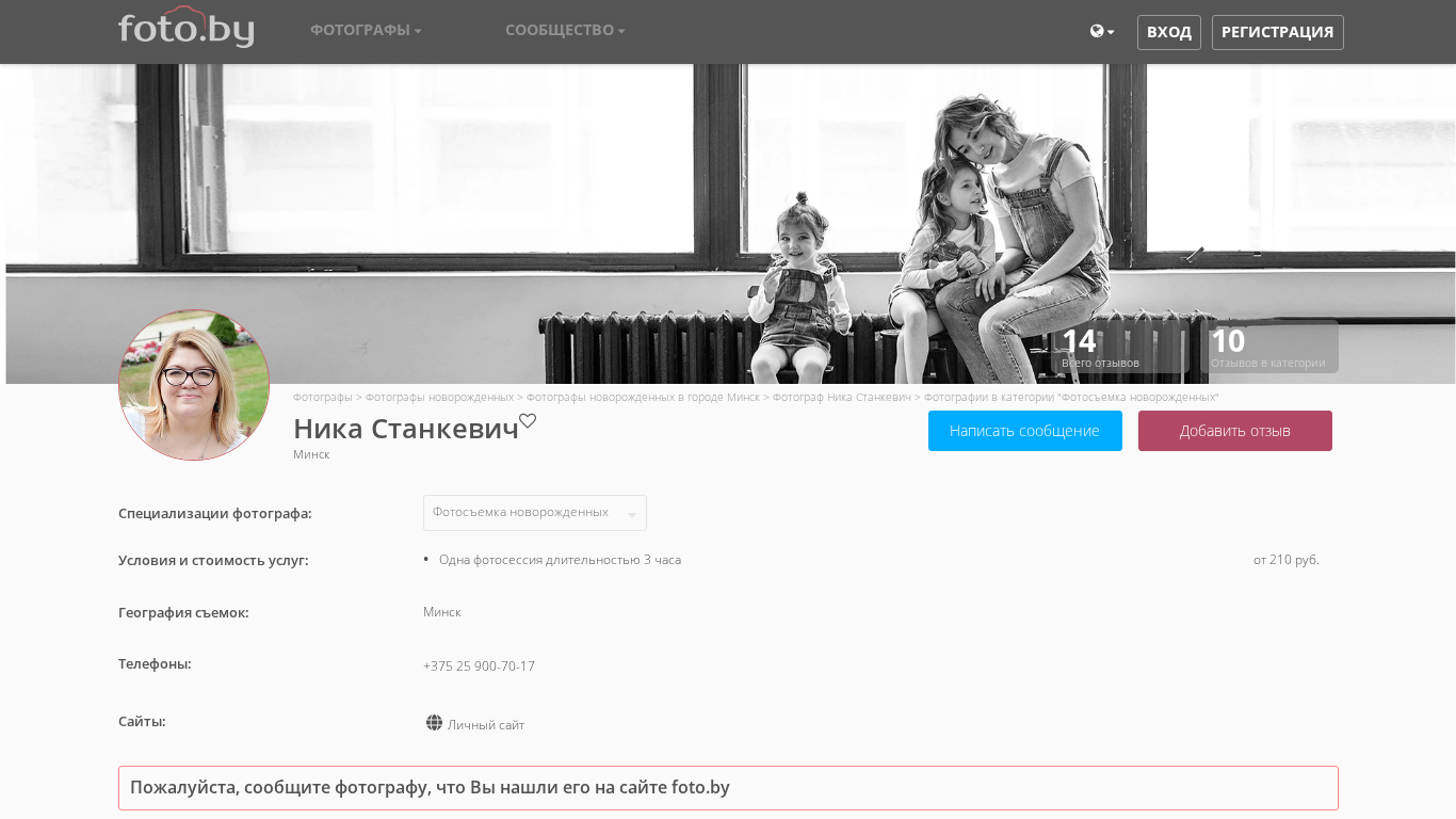 | SEO-описание | Фотографии в категории "Фотосъемка новорожденных". Сайт фотографа Ника Станкевич. Я работаю как фотограф новорожденных в городах Минск, Борисов |