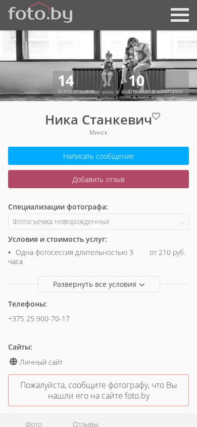 | AI-анализ | --- This online resource is a photography website belonging to Nikas Stankevich, a photographer based in Minsk, Belarus. The main focus of the site is on photography services for newborns, with categories for photo shoots and photo sessions. The website also features a community for photographers and offers various photography services and workshops. The site received 10 visitor reviews, with 14 reviews in total, all related to photographers and specifically to Nikas Stankevich's newborn photography services in Minsk. The site offers pricing starting from 210 rubles for a three-hour photo session, and the photographer's services are available in Minsk. The website includes a personal site, contact information, and links to other sites. Visitors are encouraged to inform the photographer that they found him on foto.by. The site also features a blog, announcements, and a gallery of |