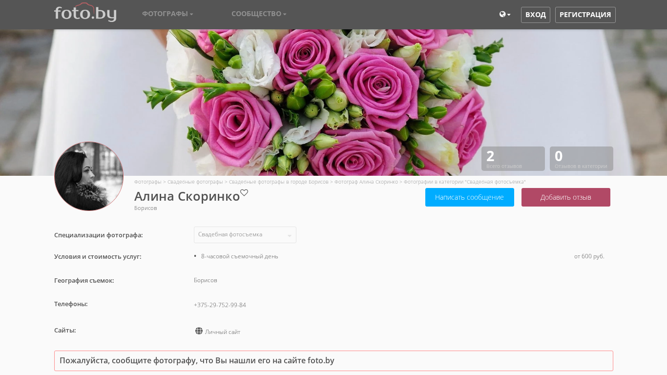 | AI-анализ | The web project "Fotoграф Алина Скоринко" is a photography website showcasing the works of Alina Skorinko, a photographer based in Borisov, Belarus. The website offers photography services in various categories including portrait, wedding, and event photography. Alina works in the cities of Borisov, Minsk, and Moloodecnoy. The website contains a catalog of photographers, a community of photographers, and a blog. The main page alternates between the catalog and the community. Users can write messages, add reviews, and view the photographer's portfolio and pricing information. The photographer specializes in wedding, portrait, and event photography with pricing starting from 600 rub for an 8-hour shoot. The website displays a phone number, a personal site link, and a request to inform the photographer that they found him on foto.by. The |