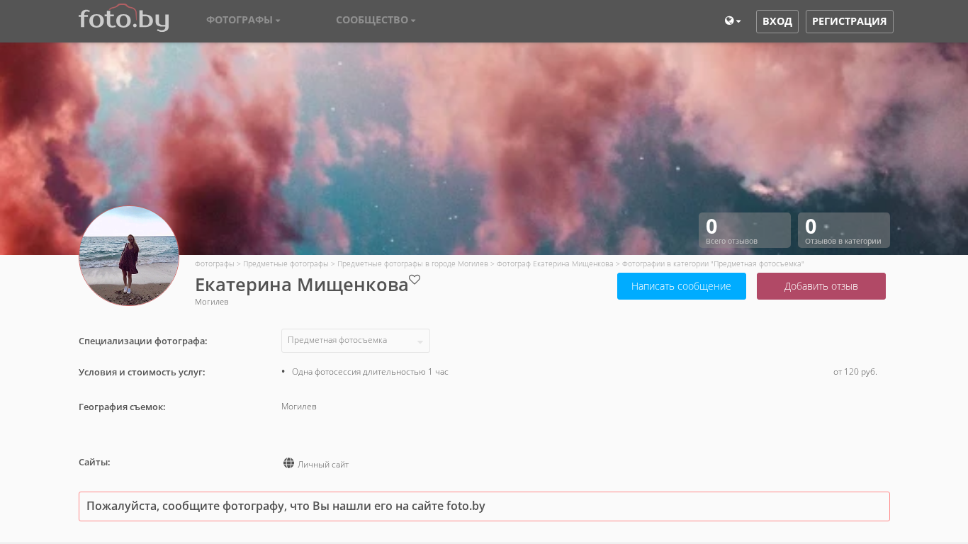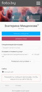 | AI-анализ | This online resource is a personal photography portfolio website for photographer Ekaterina Mishchenkova based in Mogilev, Belarus. The website primarily features her work in the category of "Predmetnaya fotosyemka," or object photography. The homepage displays a catalog of photographers, with Ekaterina's page being one of the options in the city of Mogilev. Her portfolio includes various objects and food photography. The website also includes information on her pricing and services, which start at 120 rubles for a one-hour photo session. The site is available in both Russian and Belarusian languages. Visitors can leave reviews for the photographer and view more of her work by clicking on the links provided. |