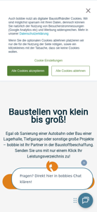 AI-анализ | The portal Bobbie.de is a professional building materials trading platform offering comprehensive building material logistics and personalized service. The website's title is "Baustoffhandel 4.0" and it boasts of top-quality building materials at competitive prices. The site includes features such as a personal account, search functionality, and a contact number for inquiries. It also mentions optional cookies for site usage and analytics. The navigation menu includes sections for the company, team, and contact information. The domain is bobbie.de. |