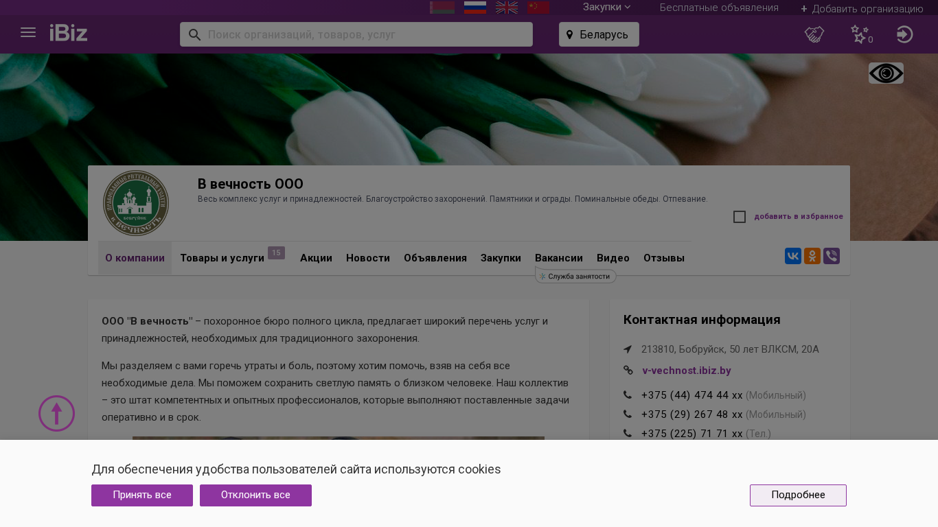 SEO-описание | В вечность ООО - Весь комплекс услуг и принадлежностей. Благоустройство захоронений. Памятники и ограды. Поминальные обеды. Отпевание.. Схема проезда, контактные телефоны, адрес компании В вечность ООО. 213810, Бобруйск, , 50 лет ВЛКСМ, 20А |