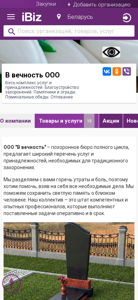 AI-анализ | This website is a funeral services and memorials company, "Вечность ООО", located in Bobruisk, Belarus, at 213810, 50 лет ВЛКСМ, 20A. The company offers a full range of services and related products for traditional burials, including cemetery maintenance, transportation services within Belarus and Russia, funeral services, production and sale of memorials and fences, and memorial meals. The company also offers transparent pricing and payment plans. The website provides an opportunity to request a consultation and offers various related products such as ritual wreaths, baskets, artificial flowers, church attributes, coffins, crosses, and memorials. The website is part of the iBiz search platform and offers various company-related information, including news, vacancies, and customer reviews on social media. |