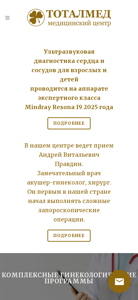 | AI-анализ | This online resource is a medical center called "ТОТАЛМЕД" located in Minsk, Belarus. The center offers services in gynecology, cardiology, endocrinology, and ultrasound diagnosis (УЗД). The website includes a blog and contact information for making appointments online. The ultrasound diagnosis for both adults and children is conducted using the Mindray Resona I9, an advanced-class diagnostic device from 2022. One of the specialists at the center is Andrey Vitalevich Pravdin, a skilled gynecologist and surgeon who was the first in Belarus to perform complex laparoscopic surgeries. The center offers discounted comprehensive gynecological programs and ultrasound programs. The medical center "ТОТАЛМЕД" has been caring for patients' health since |