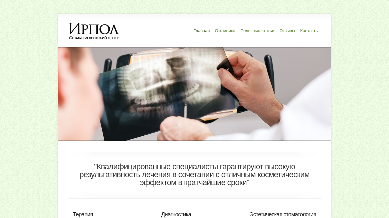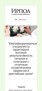 | SEO-описание | «Ирпол» оказывает все виды стоматологических услуг: терапия, диагностика, эстетическая стоматология, ортопедия, хирургия и другие. |