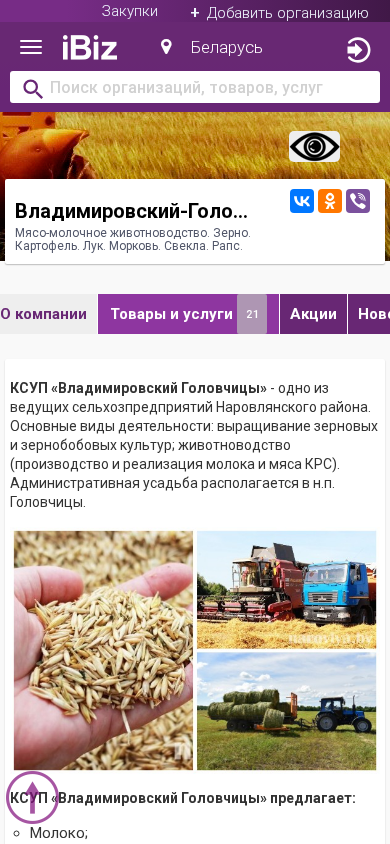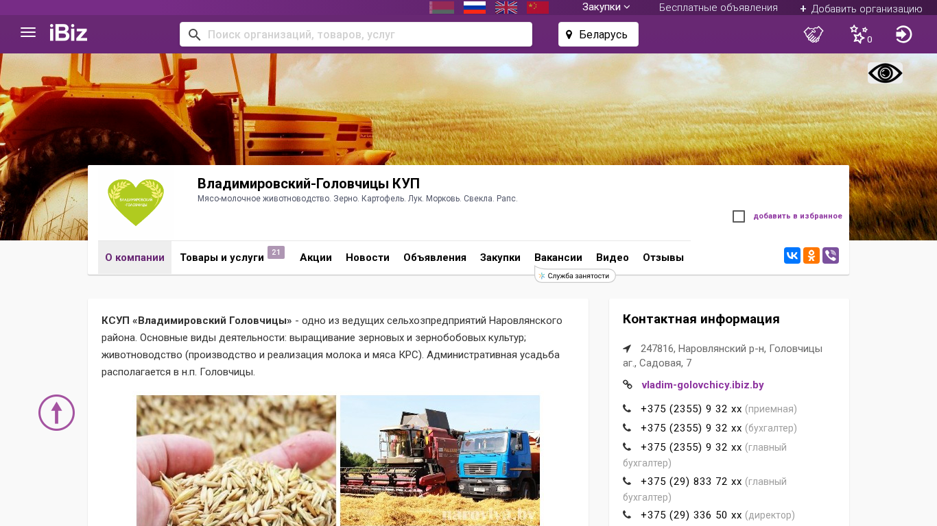 | Название / Заголовок | Владимировский-Головчицы КУП - Мясо-молочное животноводство. Зерно. Картофель. Лук. Морковь. Свекла. Рапс.. 247816, , Головчицы аг., Садовая, 7 |