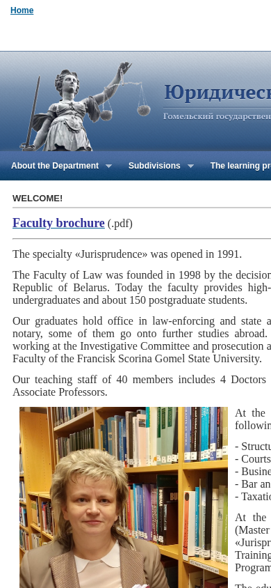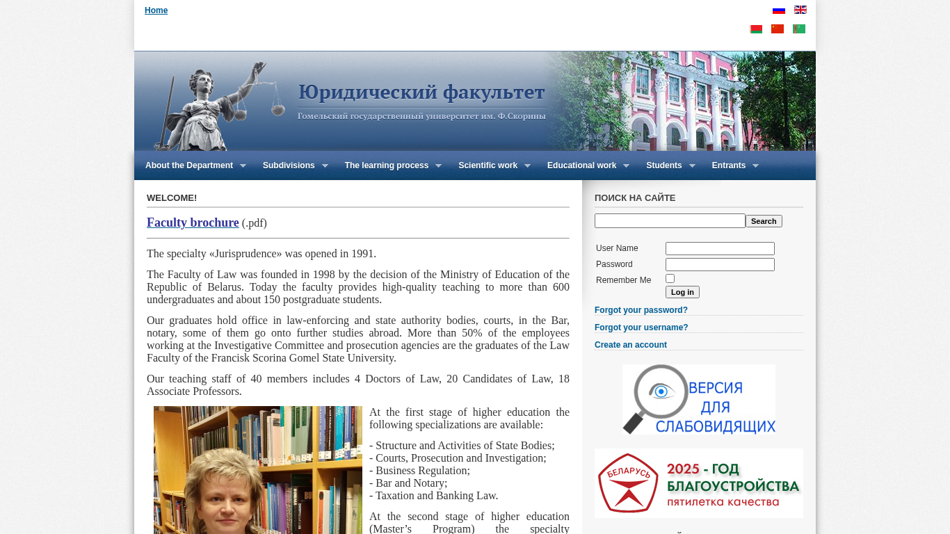 | AI-анализ | The portal is the official website of the Juridical Faculty at the Gomel State University (GSU) in Belarus. The faculty, also known as Юрфак, was founded in 1998 and offers undergraduate and postgraduate education in jurisprudence. With over 750 students, the faculty provides high-quality legal education and research, with a focus on civil, criminal, and political sociology disciplines. The faculty has a law clinic and various subdepartments, including those for civil law, theory and history of state and law, criminal law and process, and political sociology. The website offers information about the faculty's history, staff, subdivisions, teaching and methodologies, scientific research, and educational programs. Additionally, it provides resources for students, such as a schedule of preparation and publication of textbooks, and information for prospective students, including a special |