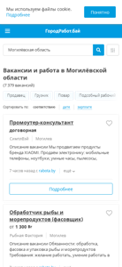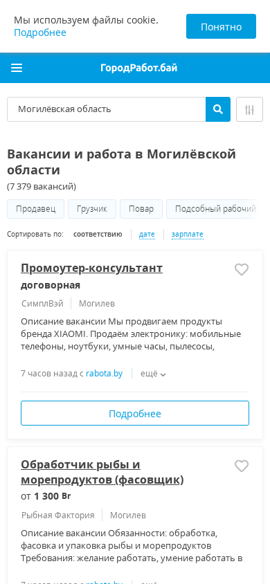 | AI-анализ | The portal mogilyov-oblast.gorodrabot.by is a job search website dedicated to vacancies and employment opportunities in the Могилёвская область of Belarus. It offers over 7,379 current job listings directly from employers. The website provides a quick and convenient way to search for jobs in the region with various filters and services, such as a production calendar, salary calculator, blog, and help section. Some of the listed jobs include positions for a seller, loader, cook, warehouse worker, accountant, cleaner, electrician, taxi driver, driver, manager, packer, decorator, cashier, and laborer. The website also has a section for sorting jobs by date or salary. One of the job postings is for a promoter-consultant for the SimplVay brand, which sells XIAOMI electronics, including mobile phones |