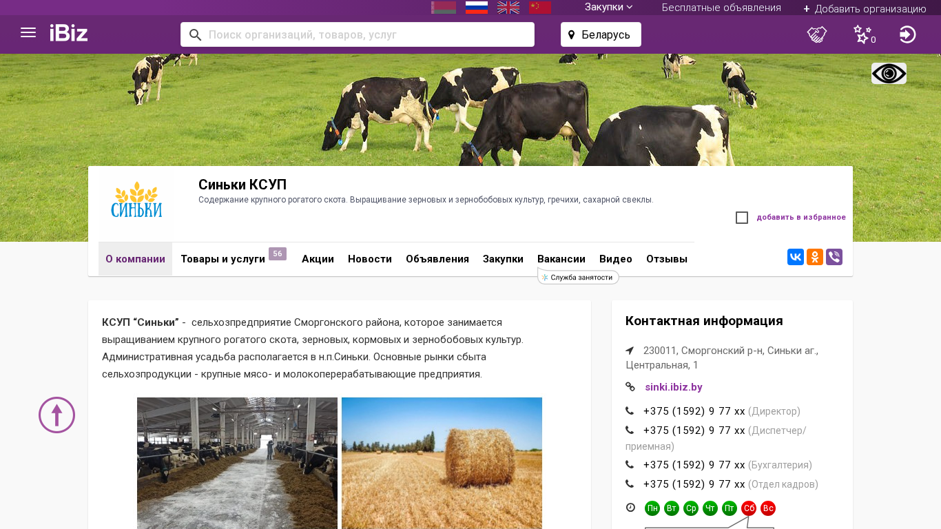 | AI-анализ | The web project "Sinki KSUP" is a farming enterprise located in the village of Siniki, in Centralnaia Street 1, Belarusian district 230011. The business specializes in cattle farming and cultivation of grains, legumes, sugar beets, and buckwheat. The main markets for selling agricultural produce are large meat and dairy processing plants. Sinki KSUP offers and sells the following products: Milk, Beef, Feed for livestock, Sugar beets, and Buckwheat. The farm owns a substantial transport fleet, machinery, dairy, and livestock facilities. The enterprise continues to improve product quality, increase production volumes, and adopt new technologies. Competitive prices, favorable business conditions, and excellent service are proposed. The organization also works with young people. For directions, please refer to the Yandex |