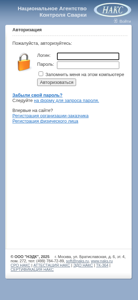 | AI-анализ | This website is titled "Авторизация" (Authorization) and is part of the .BY domain belonging to the National Control Agency for Welding (Национальное Агентство Контроля Сварки, NAKS) in Belarus. The description mentions the term "Центр.НАКС" (Center.NAKS) and keywords include "пароль" (password), "накс" (NAKS), "авторизация" (authorization), "логин" (login), and "запомнить" (remember me). The content seems to allow users to log in with their credentials and offers the option to remember the login details on the computer. The text also indicates that users can request a forgotten password. The footer includes information about NAKS, such as its legal entity name "ООО "НЭДК |