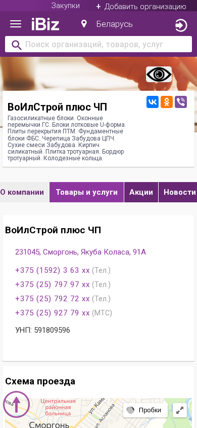| Название / Заголовок | ВоИлСтрой плюс ЧП - Газосиликатные блоки. Оконные перемычки ГС. Блоки лотковые U-форма. Плиты перекрытия ПТМ. Фундаментные блоки ФБС. Черепица Забудова ЦПЧ. Сухие смеси Забудова. Кирпич силикатный. Плитка тротуарная. Бордюр тротуарный. Колодезные кольца.. 231045, Сморгонь, , Якуба Коласа, 91А |
