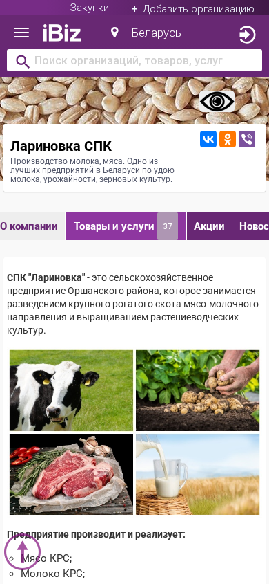 | AI-анализ | The website is for "Larinovka SPK," a farm enterprise located in Orshansky district, Belarus. The organization specializes in cattle breeding for meat and milk production and farming of various crops, including zernovykh and kormovykh cultures, as well as zernobobovykh and kukuruzy cultures. Larinovka SPK produces and sells meat from large-horned cattle, milk from large-horned cattle, grains, grain legumes, forage crops, corn, and potatoes. The company prides itself on delivering high-quality products to the public. The website includes a map with directions, contact information, and operating hours. The contact person is Alexander Kukhtenkov, the director. The website is listed under the "Agriculture" category and also under "Agriculture in Orsha." |