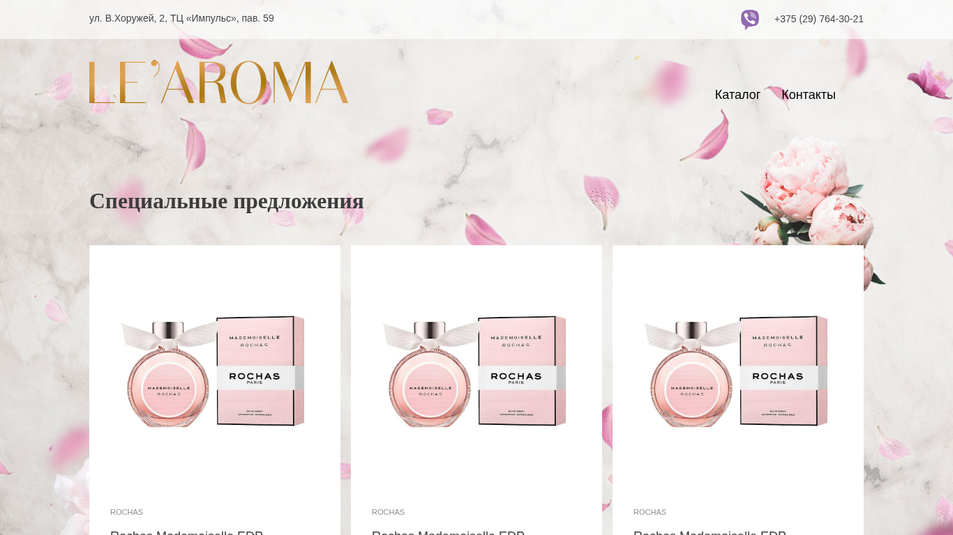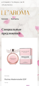 | AI-анализ | --- This website is the homepage of Le'Aroma, a perfume store located at ul. V.Hoружей, 2, TС «Импульс», пав. 59 in Belarus. The website offers a catalog of perfumes and features brands such as ROCHAS, Mademoiselle, EDP, and various other brands. The top keywords on the website include "byn," "tester," "rochas," and "нет." Users can select perfume types (women's or men's) and brands, and choose the volume they desire (ranging from 40ml to 200ml). Some specific perfumes and their availability and prices are listed, including Carolina Herrera 212 Sexy, Lanvin A Girl in Capri, and Angel Schlesser Adorable. The website also has |