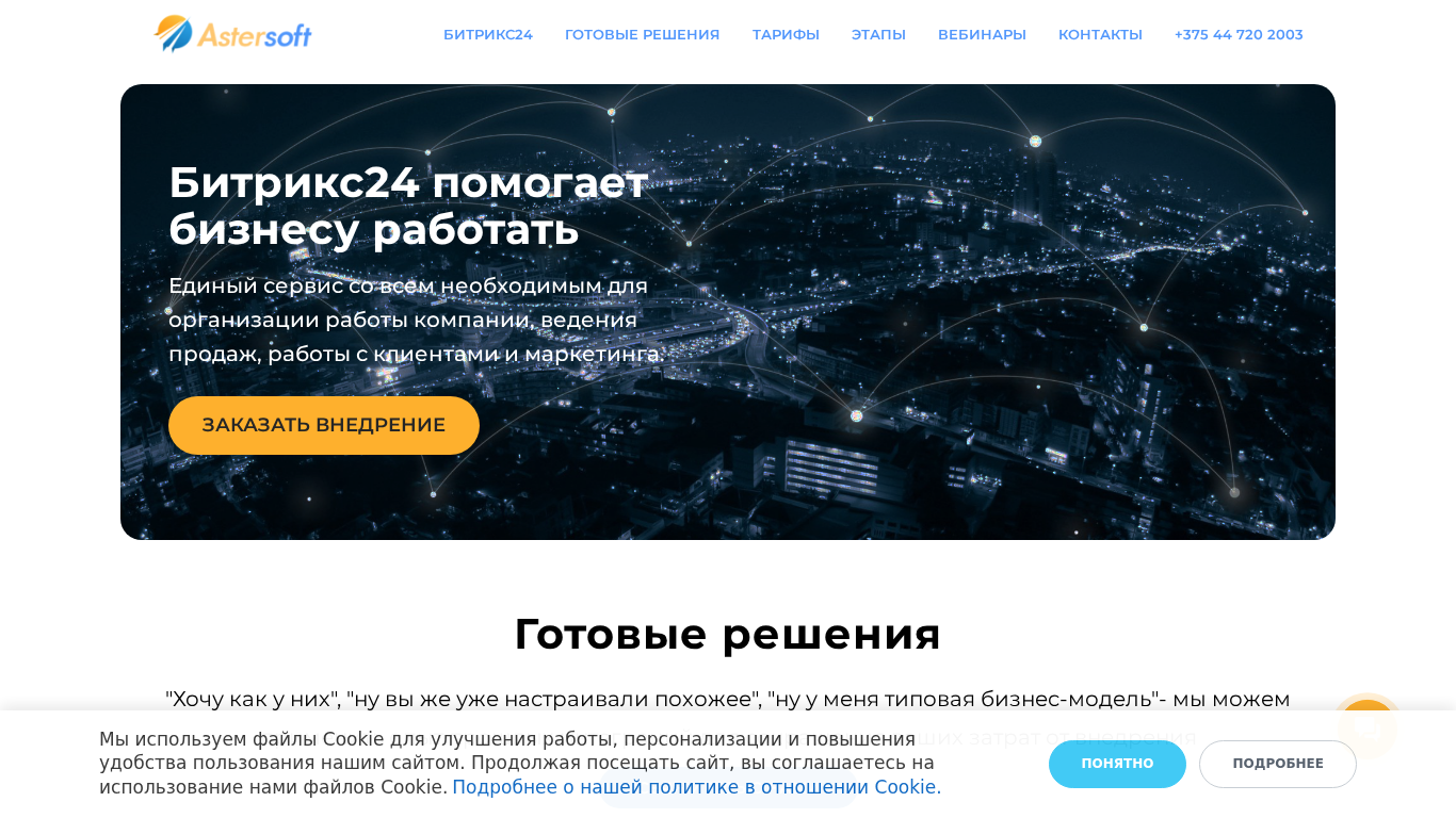 The portal Astersoft is a business solutions provider using the Bitrix24 platform. It offers various services including ready solutions, tariffs, stages, and webinars for businesses. The platform helps businesses work effectively by providing a unified service for organizing work, sales, customer relations, and marketing. Available solutions cater to businesses of different sizes and industries, such as HoReCa, medicine, and production. The website contains HTML code with styles and requires specific image sizes for blocks. Contact information includes two phone numbers for Belarus.