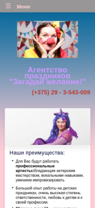 | AI-анализ | The website is an agency for children's parties "Загадай желание!" with phone number +375 29 - 3-543-009. They offer professional artists with acting and singing skills, improvisation abilities, a large experience in children's parties, high responsibility level, and love for children and their profession. The agency specializes in creating unique characters and atmospheres for various children's events, such as birthdays, graduations, and parties outside the city. Their programs are developed in consultation with a practicing child psychologist and can be tailored for children with developmental issues. Each program includes a custom-made prop setup to bring the character to life and immerse children in the magical world of adventures. Their costumes are handcrafted by skilled artisans to ensure an accurate representation of the chosen character. The website also features information on their services, pricing |