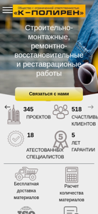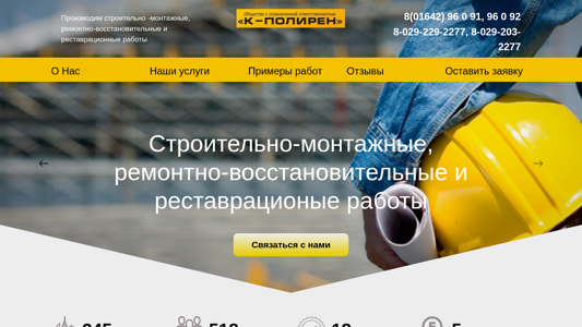| AI-анализ | The web project "K-Poliren.by" offers building, restoration, repair, and mounting services for over twelve years. Experienced workers. Free consultation. Contact numbers: 8(01642) 96 0 91, 96 0 92, 8-029-229-2277, 8-029-203-2277. The company specializes in facade repairs, including restoration - painting facades, decorative façade works (thermal rehabilitation of buildings, ventilated facades, artificial and natural stonework, cladding with siding, working with keramogranite, brick, and decorative finishing). High-altitude works for the hermetic sealing and repair of industrial and residential buildings' walls. Mounting works, including the installation and removal |