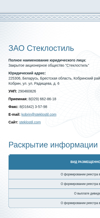 | AI-анализ | The website is for "Стеклостиль ЗАО" (Closed Joint Stock Company "Glass Fashion"), a Belarusian company located in the Kobrin district of Brest region. The website provides access to company news, as well as forms for registering to receive information, including the formation of a shareholder registry and dividend payments. Users can access their personal cabinets with an email address and password. The site was developed by EPFR.by. The following documents can be downloaded: the formation of the shareholder registry on March 30, 2023 and March 25, 2021, and information on dividend payments on April 4, 2022, and March 23, 2022. The site also includes a login page for accessing a personal cabinet. |
