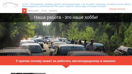 | AI-анализ | --- The web project A-C.BY offers servicing, refueling, and repairing of automotive air conditioners, as well as repair of brake and fuel systems. It provides replacement of all kinds of fluids, timing belts or chains, suspension repair, and customized jobs. The site offers services such as air conditioner refueling, decontamination, replacement of cabin filter, compressor repair, and system flushing. The site also deals in installation of auto air conditioners, complex repair, and provides information on the average time required for repairing an auto-air conditioner. A-C.BY prides itself on its personalized approach, ensuring a working component or a leaking pipe is replaced with a new one, and addressing any underlying issues. The site has been in operation for over six years, specializing in auto air conditioner repair and service. |