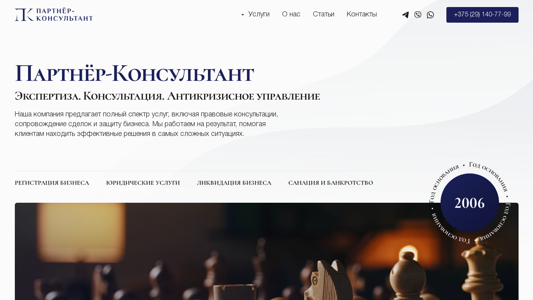 | AI-анализ | The web project "p-k.by" offers legal services to businesses in Minsk, providing legal advice to legal entities and organizations. Services include business registration, liquidation, sanitation and bankruptcy. The company has been successful in the field of legal services for over 15 years, with a team of over 100 experts specializing in various areas of law, and over 1,000 successful cases in the areas of liquidation and crisis management. Clients can consult with the company via a hotline at +375 (29) 140-77-99. Services offered include business registration, consultation on creating a business, registration of legal entities, changes to statutory documents, reorganization of businesses, opening of branches and representative offices, handling of transactions, legal advice on business activities, drafting and legal expertise of contracts and documentation, handling of claims and |