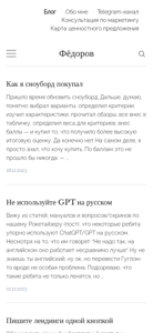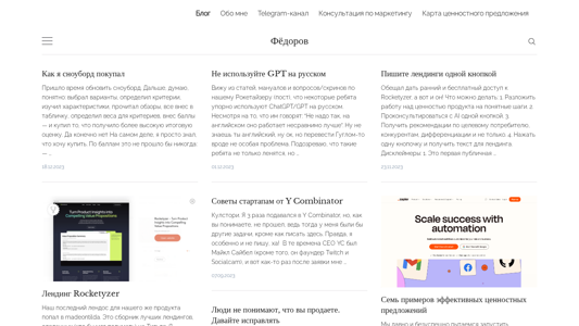 | AI-анализ | This website, titled "Фёдоров - Предпринимательство и маркеting" [Fedorov - Entrepreneurship and Marketing], is primarily focused on entrepreneurship and marketing. The description tag specifies this keyword. The author, Andrey Fedorov, regularly launches new products, founded Rocketyzer and Rocketyze, and offers consulting services in marketing. He has developed a methodology called "Карта ценностного предложения" [Value Proposition Map], and maintains a Telegram channel. The text describes his approach to purchasing a snowboard, emphasizing the importance of determining criteria and weighing options. The website also discusses using Rocketyzer instead of ChatGPT for creating landing pages with one click. The domain is fdrv.me. |