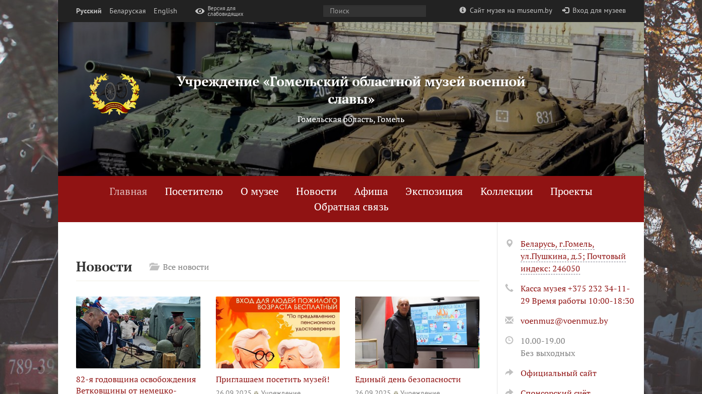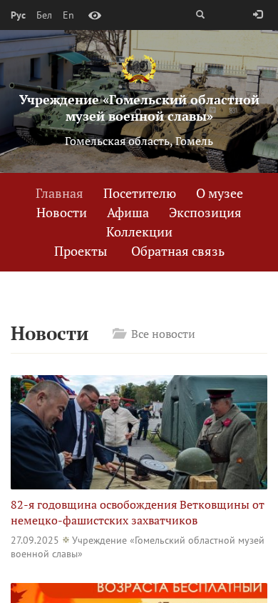 | SEO-описание | Учреждение «Гомельский областной музей военной славы» — новости и афиша мероприятий, информация для посетителей, цены, экспозиция, коллекции, материалы для музейщиков. |