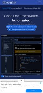 | AI-анализ | This website is the homepage for Doxygen, a widely-used documentation generator tool in software development. It automates the generation of documentation from source code comments, parsing information about classes, functions, and variables to produce output in formats like HTML and PDF. Doxygen supports various programming languages including C++, C, Python, PHP, Java, C#, Objective-C, Fortran, VHDL, Splice, IDL, and Lex. The website offers multiple output formats such as HTML, PDF (via LaTeX), Word (via RTF), and XML, providing flexibility for users to choose the format that best suits their needs. Doxygen also supports Markdown and provides cross-referencing capabilities, allowing users to navigate between different parts of the documentation and understand the relationships between different components. Additionally, Doxygen can generate graphical representations of class hierarchies and collaboration diagrams, |