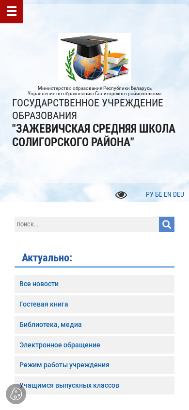 | AI-анализ | The portal "Зажевичская средняя школа Солигорского района" is a website of a secondary school located in the village of Zazhevichi in the Soligorsky district of Belarus. The site provides comprehensive information about the school, including its history, achievements, traditions, structure, and educational programs. The homepage features a calendar of events, news, and a search function. The school's mission, administrative procedures, and contact information are also available. The website is divided into sections such as "History," "Organizational Structure," "Teaching Staff," "Working Hours," and "Administrative Procedures." It also includes a section for parents, featuring a "Parent University" and information on school life in social media. The site is operated by the Ministry of Education of the Republic of Belarus and the Soligorsky Regional Executive Committee. The |