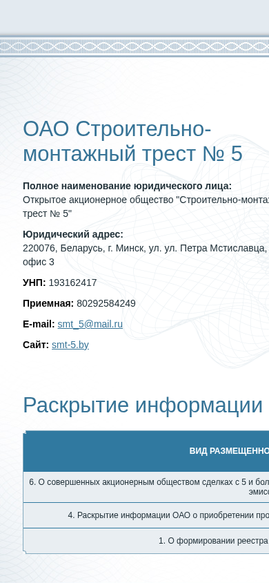 The website is for Open Joint Stock Company "Construction and Montage Trust No. 5" (SMT-5). It provides information about the company, including its full legal name, address, and contact details such as phone number and email. The website also features a news section, but currently, there are no news articles available. The company has disclosed information about two significant transactions involving the purchase of over 5% of its own shares, occurring on September 2, 2025, and September 26, 2025, respectively. Additionally, the website reveals that the company has formed a shareholder registry on July 21, 2025. The site was developed by epfr.by and includes a login page for accessing a personal cabinet.