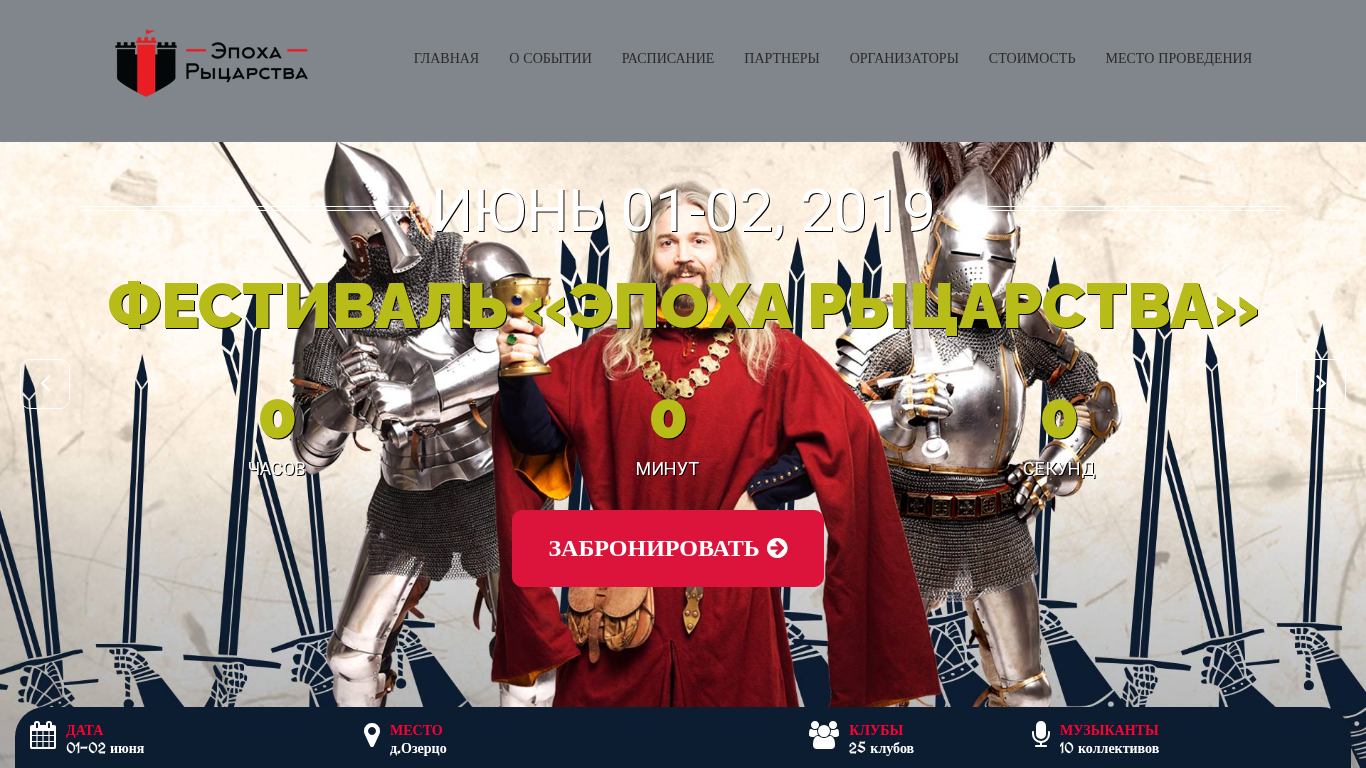 Сайт посвящен историческому фестивалю "Эпоха Рыцарей", который состоится на Белорусском государственном музее народной архитектуры и быта 1-2 июня 2019 года. Фестиваль включает в себя различные турниры рыцарей в доспехах, массовые сражения пеших воинов (бугурты), турнир на конных рыцарях, турнир на пики, турнир стрелков, лагерь рыцаря, ярмарку ремесел, верховую езду и представления средневековых музыкантов и театров. Участие в фестивале принимают группы Hardwood, Doudingi, PAWA и медийная группа "Старая Ольса" из Беларуси. Фестиваль предлагает программу с указанием времени проведения мероприятий и систему регистрации для посетителей.