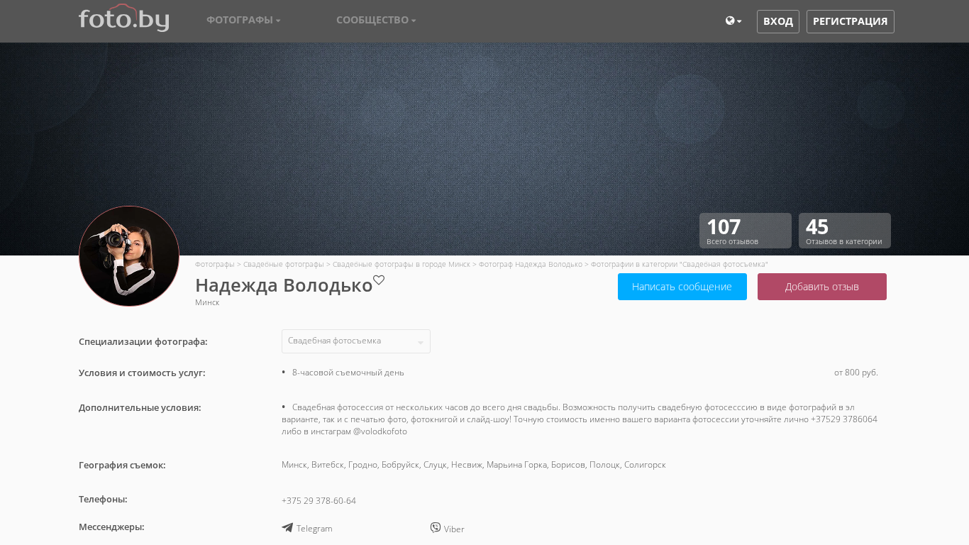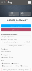 | AI-анализ | Портал является веб-сайтом, специализирующимся на фотографии свадьб. Фотограф Надзея Володко из Минска предлагает свои услуги в различных городах Беларуси и за её пределами. Сайт включает каталог фотографов, сообщество фотографов и блог. Главная страница по умолчанию отображает каталог фотографов. Фотография Надзеи Володко в категории "Свадьба" доступна. Дополнительные услуги включают фотосессии для новорожденных, корпоративные события и различные виды сессий. Цены и контактная информация уточняются напрямую у фотографа. |