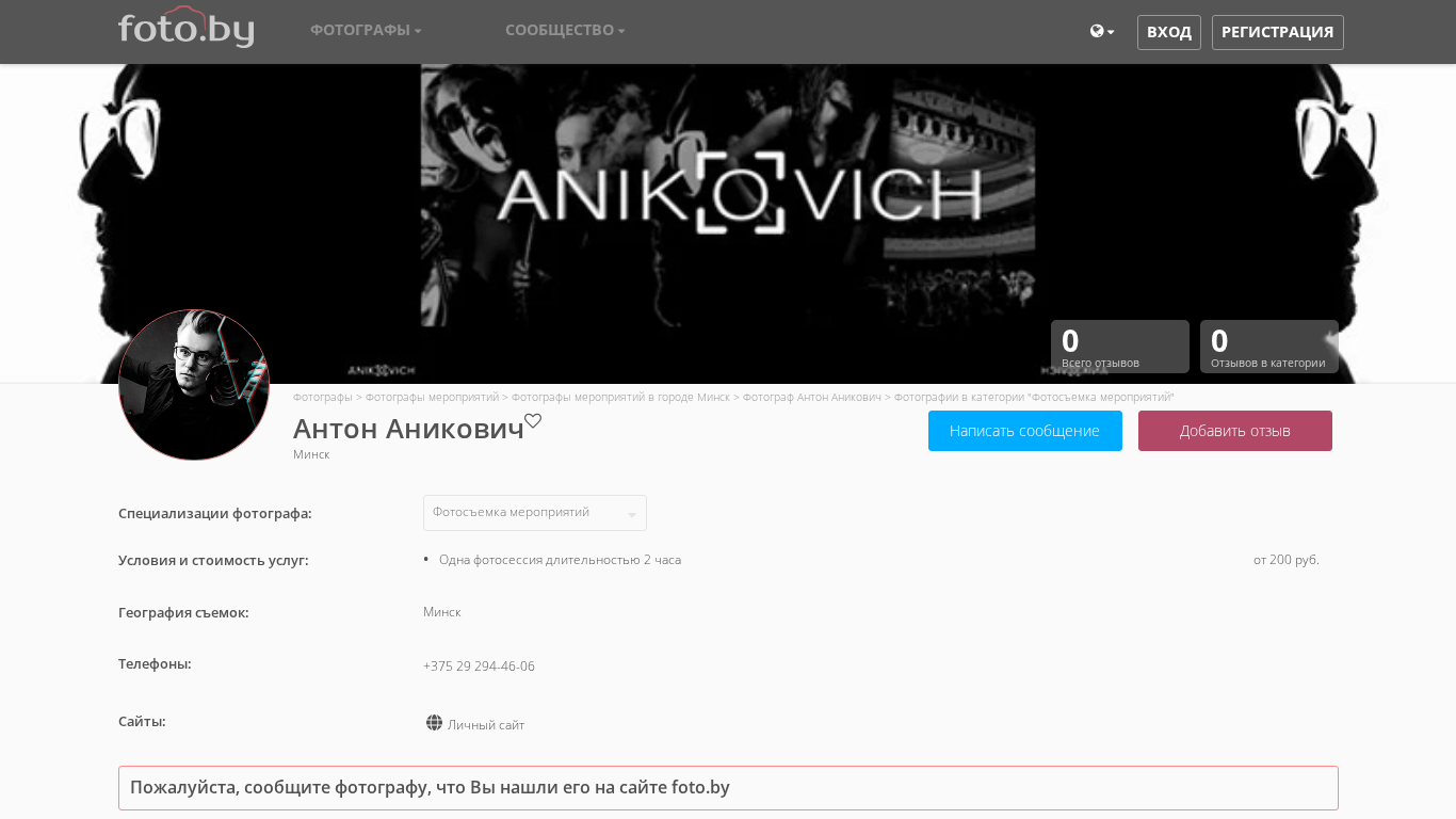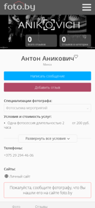 | AI-анализ | --- The web project "Фотограф Антон Аникович, Минск" specializes in photography for events. Keywords associated with this .BY domain include 'мероприятий', 'фотосъемка', 'фотограф', 'минск', 'фотографии', and 'фотографы'. The photographer, Anton Anikovich, offers portrait photography and works in the cities of Novopolotsk and Minsk. The website features a catalog of photographers, including Anton Anikovich, and offers various services such as corporate photography, wedding photography, and family photography. Visitors can also view the photographer's portfolio and leave reviews. The website is accessible in both Russian and Belarusian languages. |