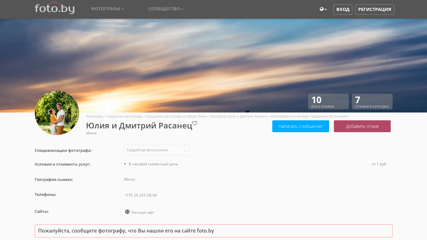 | AI-анализ | The portal raart.foto.by is dedicated to showcasing the work of photographers Julia and Dmitry Rasanec from Minsk, Belarus. The website primarily features photographs categorized under 'Свадебная фотосъемка' (wedding photography). Julia and Dmitry Rasanec are identified as wedding photographers from Minsk, but they also offer services as family photographers. Keywords associated with the portal include 'фотографии' (photographs), 'фотографы' (photographers), 'минск' (Minsk), and 'свадебная' (wedding). The website has a section for reviews and allows users to write messages or leave feedback for the photographers. The photographers' services include an 8-hour shoot starting from 1 ruble, and they cover shoots |