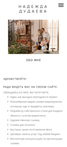 | AI-анализ | language: ru This online resource belongs to Nadzeya Duдаева (Chertkova), a versatile photographer based in Minsk, Belarus. The website showcases her services, which include taking photos and videos for various business sectors and private clients. The main focus of her work is on product photography, food photography, styling, and interior photography. She offers individualized, marketing-sensitive styles for each project and provides artistic photography, catalog-ready shots, and quick turnaround times. The site offers pricing packages for different budgets and a free consultation for organizing shoots. The photographer is a stylist, photographer, and retoucher, managing projects from concept to re-touching. She works in Minsk but accepts commissions from anywhere in the world. Prices on the site are approximate, and she customizes each project's cost. Clients can contact her through various means, |