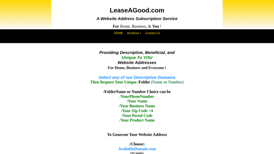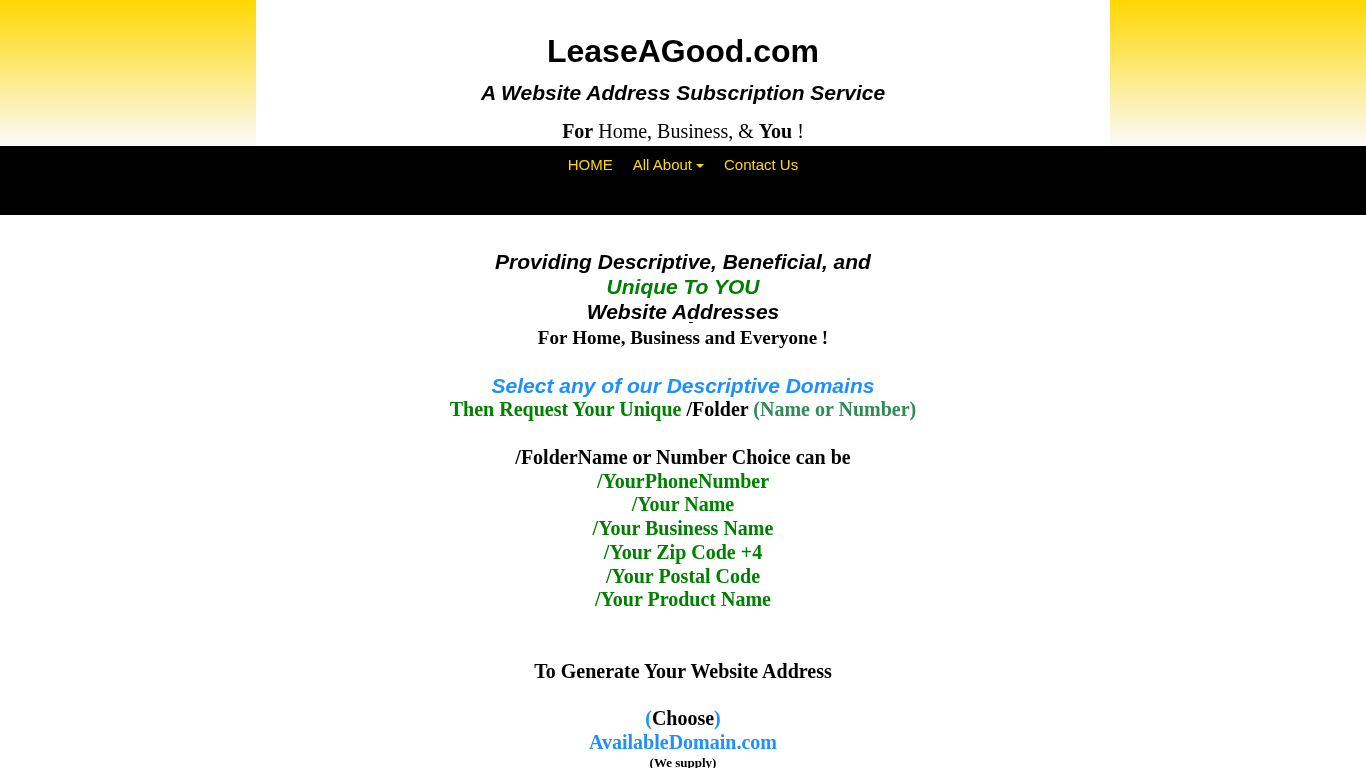 | AI-анализ | domain_type: .com The website LeaseAGood.com is a subscription service that offers home and business users the opportunity to lease descriptive domain names, sub-domains, and domain folders as unique website addresses. Users can choose from a list of available domain names and create their own custom folder name or number to generate a secure and personalized website address. The website provides examples of potential domain and folder combinations, such as "AvailableDomain.com/YourFolderWanted" or "OurDomain.com/YourFolderNameOrNumber." Users can search for domain names using keywords and view a list of available options at DomainNames.us.com. The website emphasizes the benefits of having a unique and descriptive website address for home, business, and individual use. |