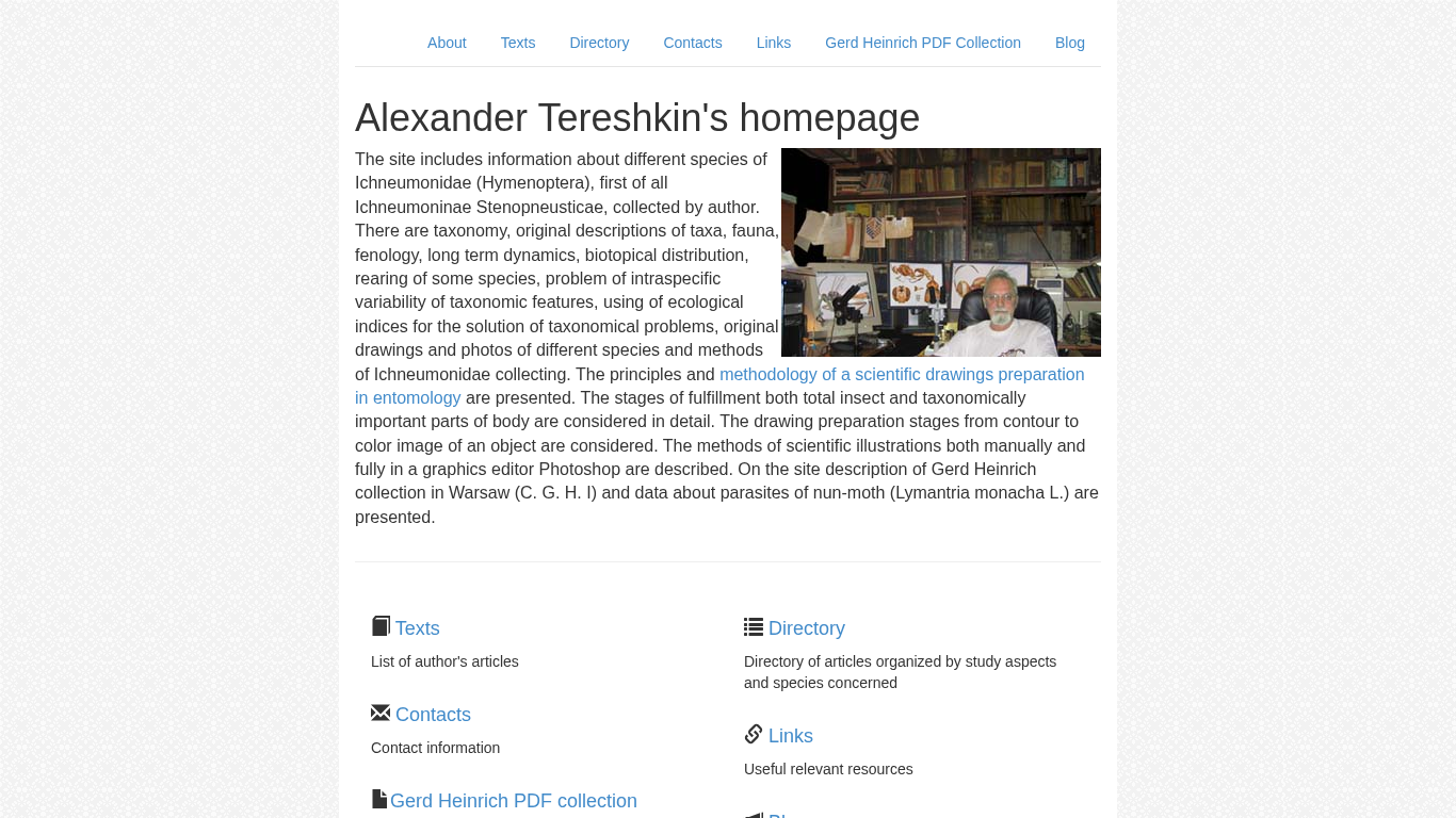 | AI-анализ | language: en country: BY type: personal size: medium category: science access: public owner: Alexander Tereshkin created: 2000-08-16 modified: 2014-08-20 The web project 'Alexander Tereshkin's homepage' is dedicated to providing information on various species of Ichneumonidae (Hymenoptera), with a focus on Ichneumoninae Stenopneusticae. The author of the site, Alexander Tereshkin, has collected extensive data on these insects, including taxonomy, original descriptions, fauna, phenology, biotopical distribution, and methods of rearing some species. The site also covers the problem of intraspecific variability of taxonomic features and the use of ecological indices to solve taxonomical problems. Visitors |