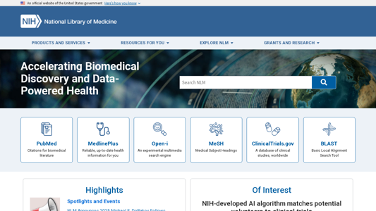 | AI-анализ | language: en The website National Library of Medicine - National Institutes of Health is an official United States government website belonging to the National Library of Medicine and the National Institutes of Health. It offers various products and services related to health, research, and clinical trials, including ClinicalTrials.gov, Digital Collections, LocatorPlus Catalog, Medical Subject Headings (MeSH), MedlinePlus, PubMed/MEDLINE, Unified Medical Language System (UMLS), and resources for researchers, publishers, librarians, educators/trainers, health care professionals, and the public. The site features secure connections using HTTPS and is dedicated to providing reliable, up-to-date health information and advanced biomedical research tools. |
