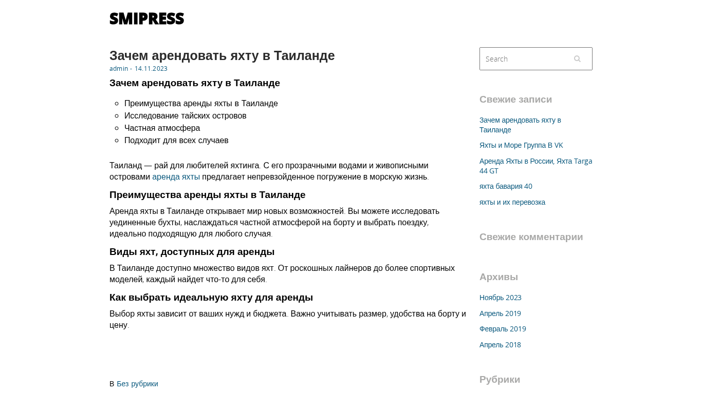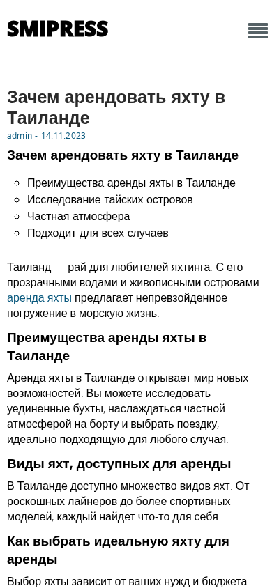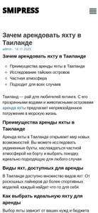 | AI-анализ | language: ru This website SmiPress - Яхтинг в России (SmiPress - Yachting in Russia) focuses on yachting in Russia. The title suggests the topic is about renting a yacht in Russia and the benefits of doing so. The description mentions advantages of renting a yacht in Thailand but also offers yachting experiences in Russia. The website discusses various types of yachts available for rent in Thailand and Russia. Keywords include 'yachts', 'rent', 'charter', and 'Thailand'. The top words list indicates a significant focus on yachts and the term 'yachting'. The website appears to be part of a larger social media group, as indicated by references to a VK group named 'ВK: Яхты и Море' (VK: Yachts and Sea). The domain is smipress.ru and the |